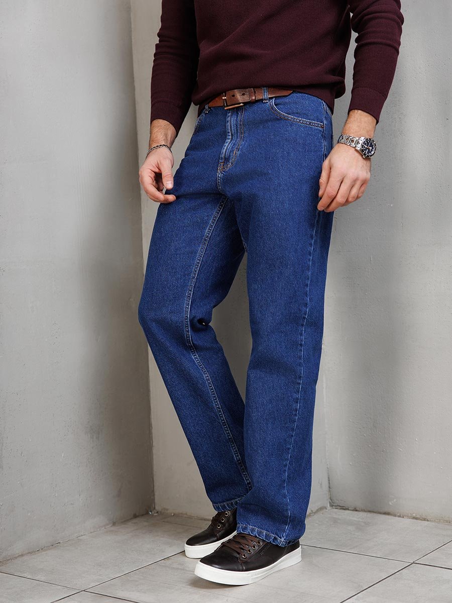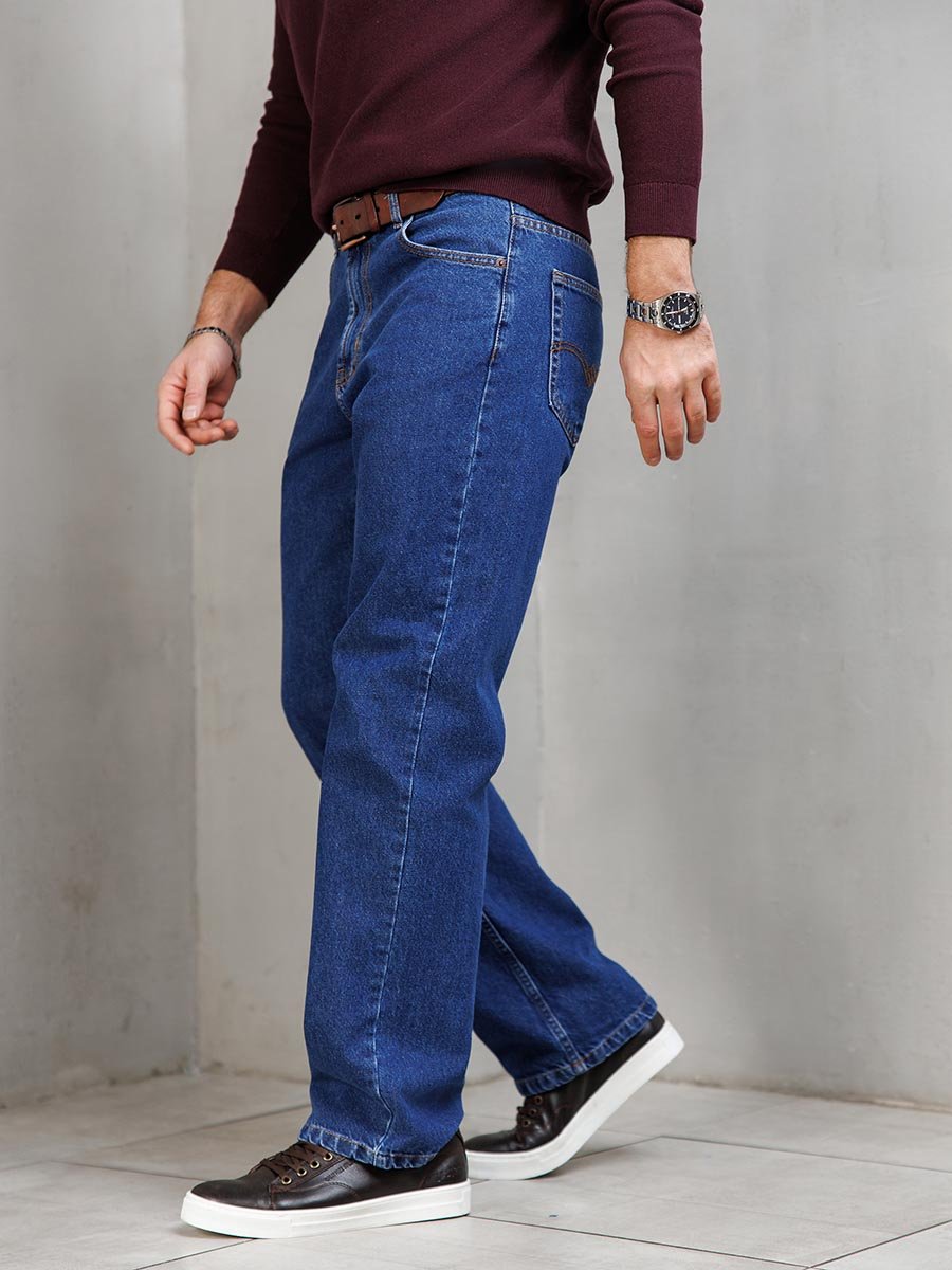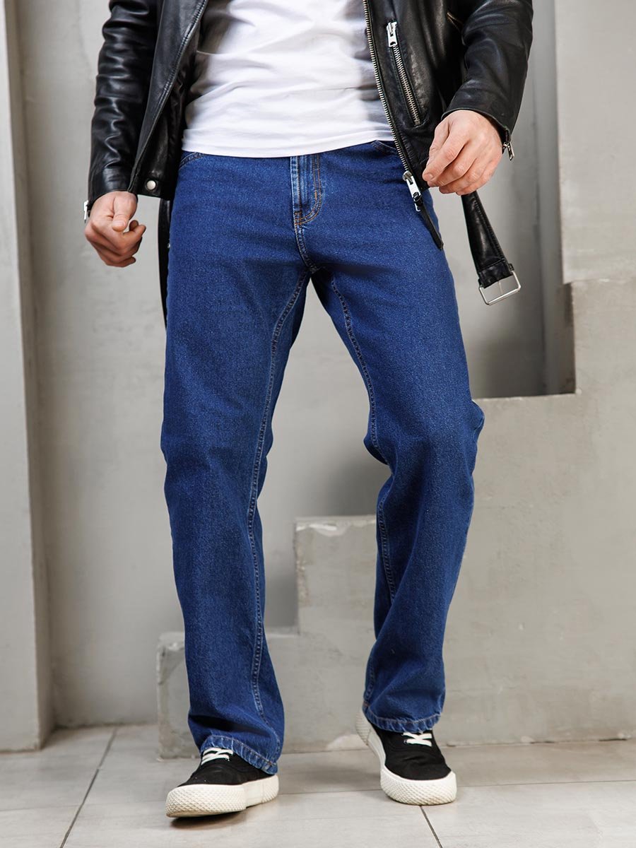 Мужские классические джинсы с пятью карманами. Посадка Comfort fit (свободные по бедру), широкие в колене и по низу, высокая талия. Застежка на молнии. Выполнены из ткани denim. Классическая темная стирка..
