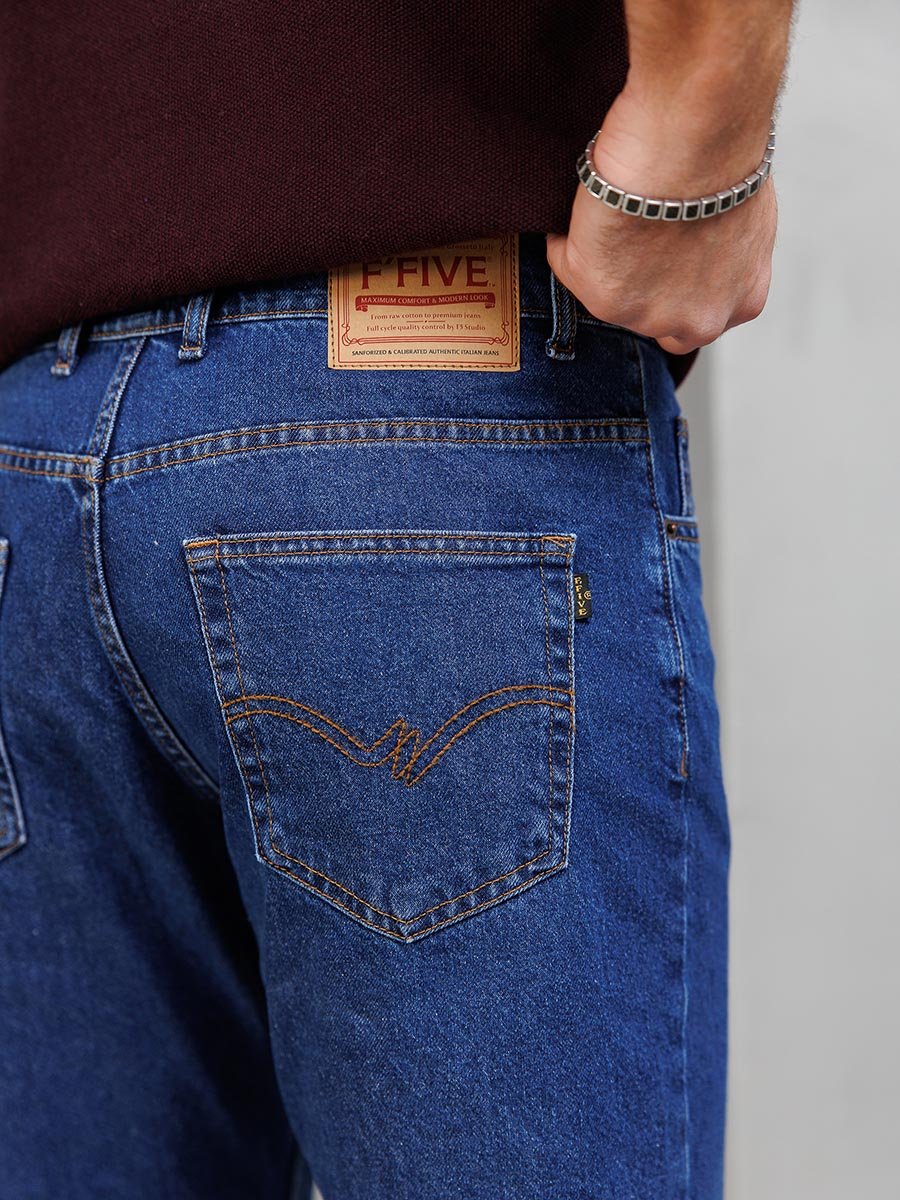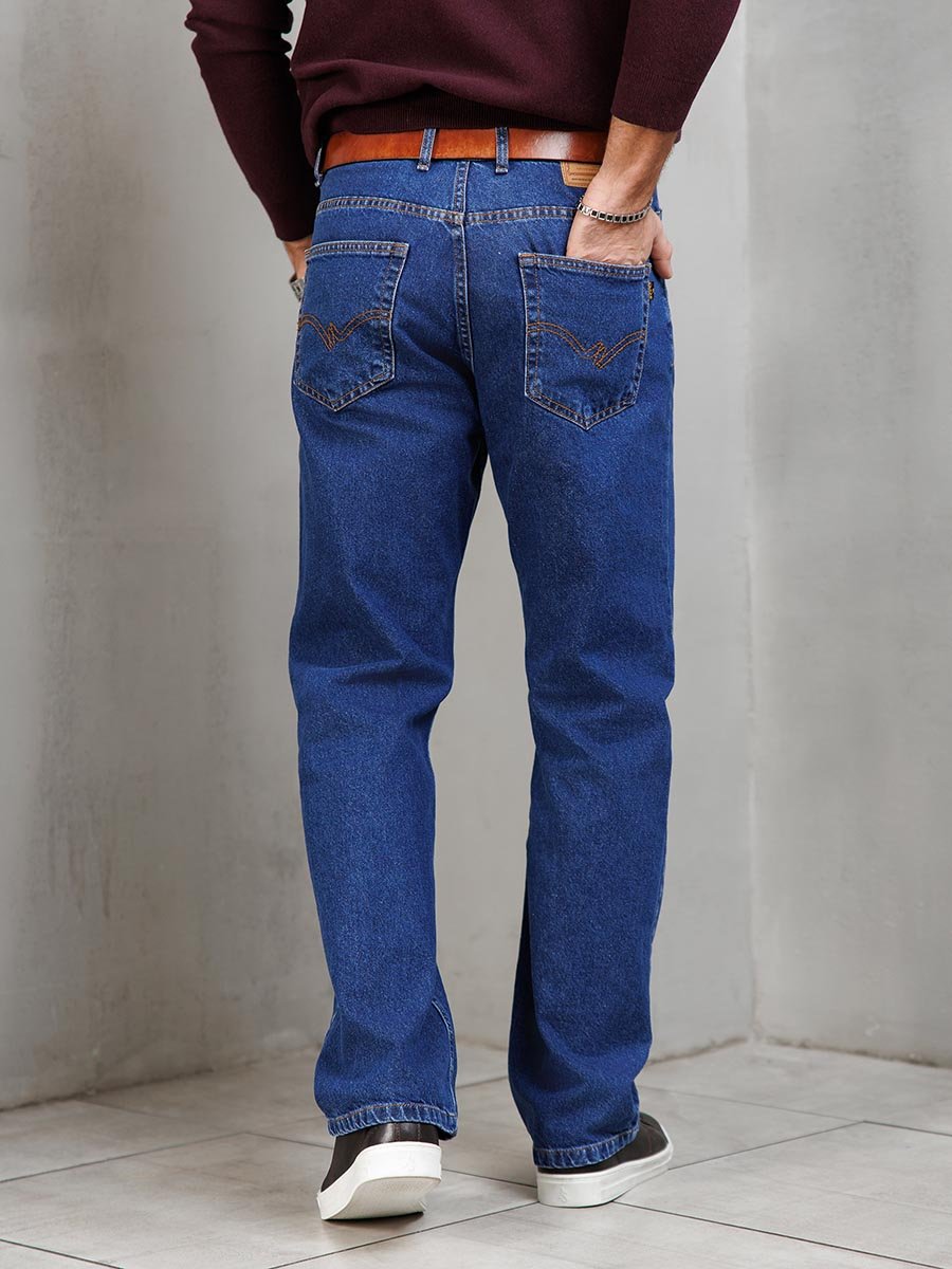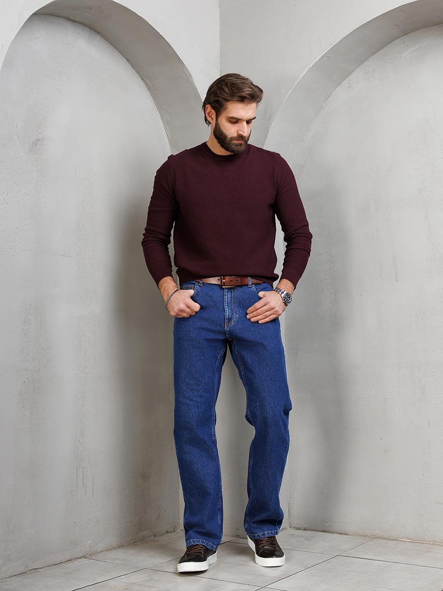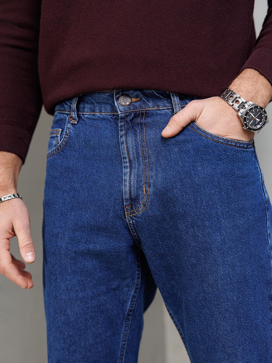 Мужские классические джинсы с пятью карманами. Посадка Comfort fit (свободные по бедру), широкие в колене и по низу, высокая талия. Застежка на молнии. Выполнены из ткани denim. Классическая темная стирка..