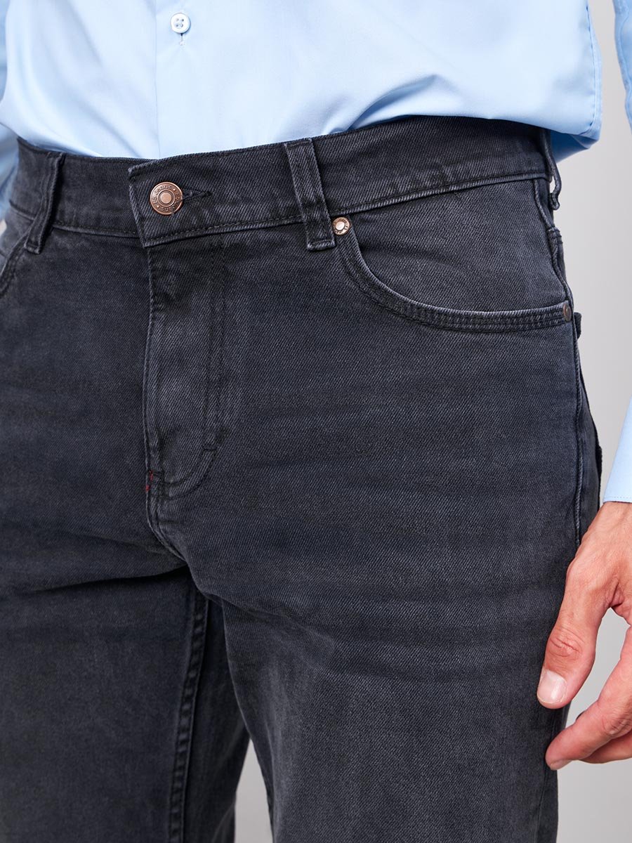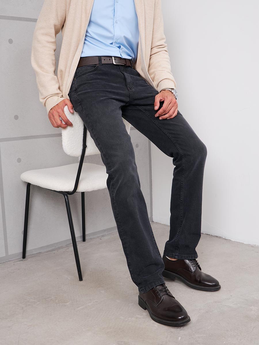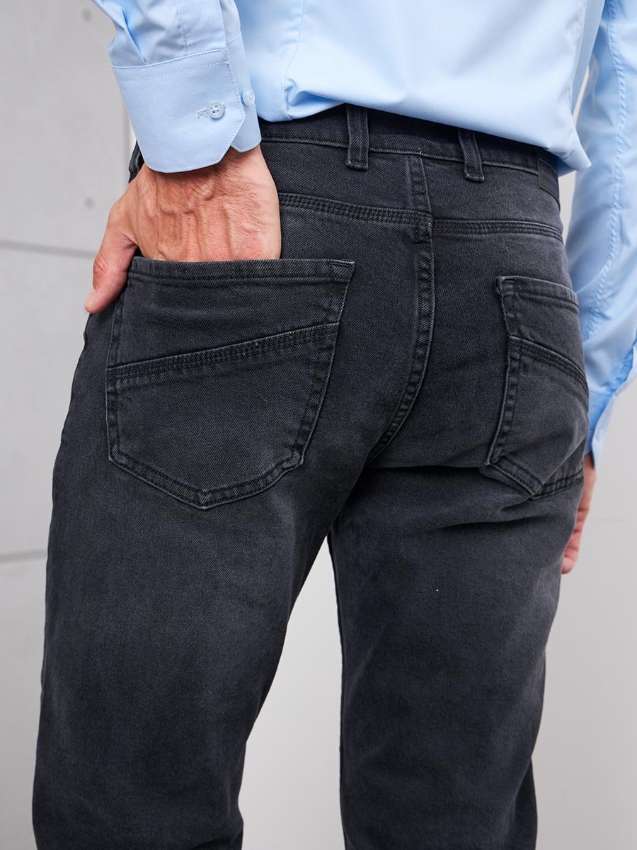 Мужские модные джинсы с пятью карманами. Посадка Slim fit (облегающие по бедру), средняя талия спереди, высокая сзади. Застежка на молнии. Немного зауженные к низу. Боковой шов сделан в разутюжку. Выполнены из слабоэластичной ткани denim comfort stretch, цвет ткани Black/Black (лицевая и изнаночная стороны ткани черные). Средняя стирка с потёртостями и "усами" спереди и потёртостями сзади. Основной оттенок ткани после стирки темно-серый.