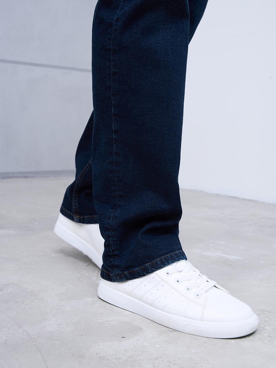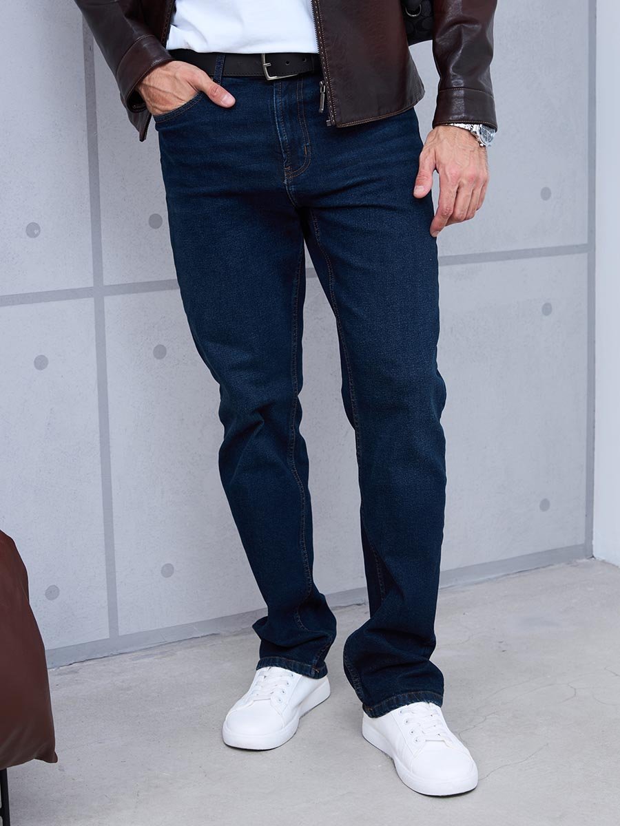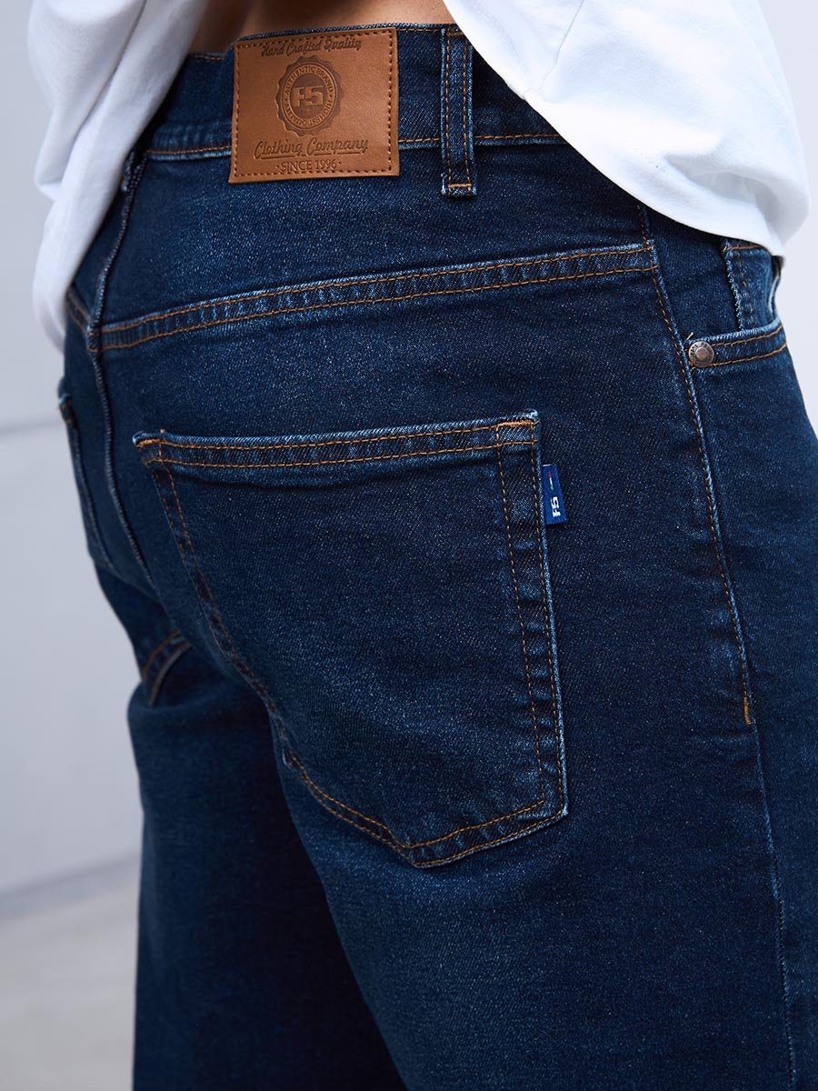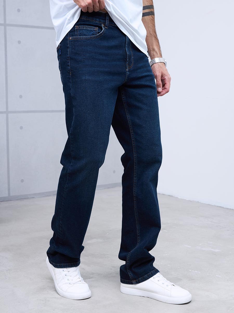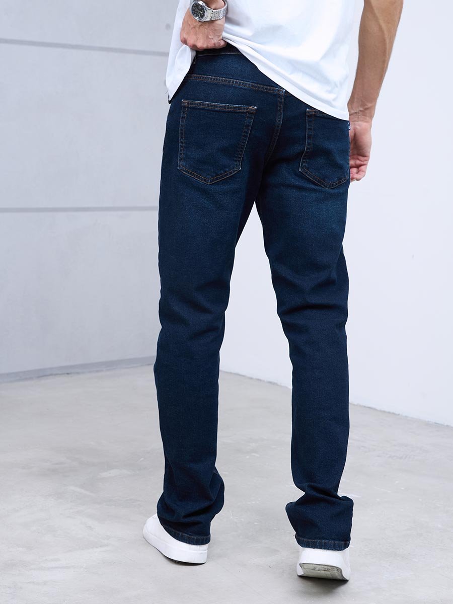 Мужские классические джинсы с пятью карманами. Посадка Regular fit (полуоблегающие по бедру), высокая талия, немного заужены к низу. Застежка на молнии. Выполнены из слабоэластичной ткани denim comfort stretch. Боковой шов сделан "в разутюжку", к нижней части шва пришита специальная декоративная тесьма "selvadge", имитирующая контрастную кромку джинсовой ткани. Темная стирка со слабовыраженными потёртостями и "усами" спереди и потёртостями сзади. Джинсы дополнительно чуть-чуть подкрашены в желтый цвет для получения эффекта "GET DIRTY", т.е. эффекта запачканных джинсов.