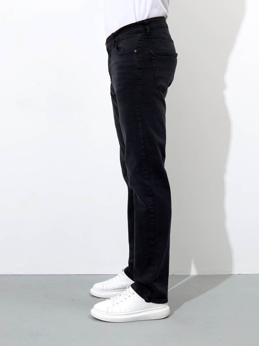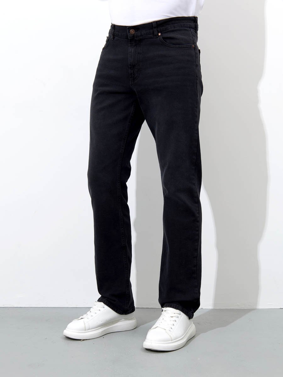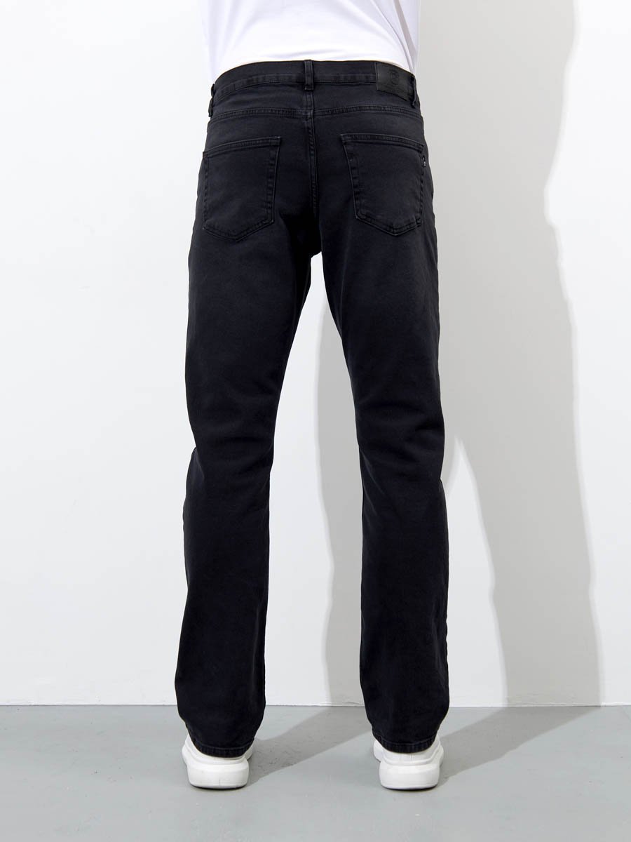 Мужские классические джинсы с пятью карманами. Посадка Regular fit (полуоблегающие по бедру), средняя высота талии. Застежка на молнии. Немного зауженные к низу. Выполнены из слабоэластичной ткани denim comfort stretch, цвет ткани Black/Black (лицевая и изнаночная стороны ткани черные). Темная стирка со слабовыраженными потёртостями спереди и сзади.