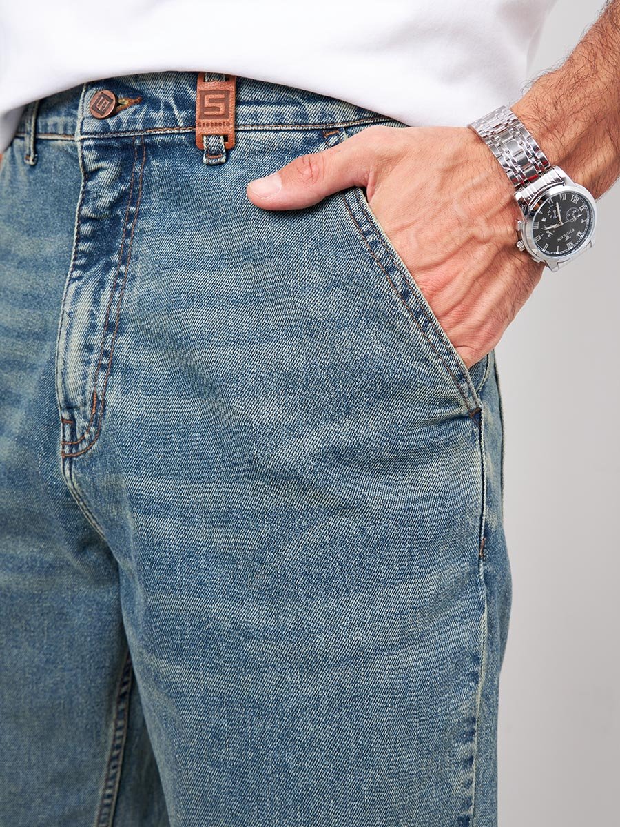Мужские комфортные модные джинсы "Бананы" с пятью карманами.Для удобства боковые карманы джинсов сделаны косыми , т.е. карманы "хулиганы". Высокая талия, свободные по бедрам и бедру и узкие внизу. Застежка на молнии. Выполнены из классической ткани denim, Классическая средняя стирка "stone wash".Джинсы дополнительно чуть-чуть подкрашены в желтый цвет для получения эффекта "GET DIRTY", т.е. эффекта запачканных джинсов.