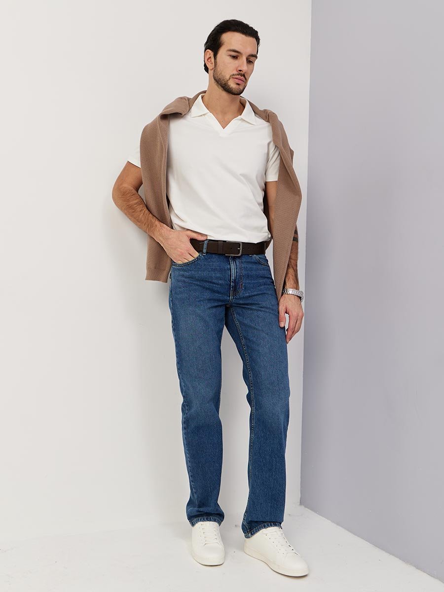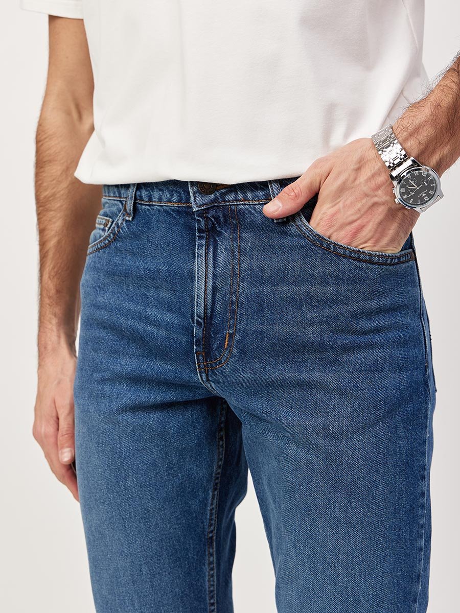 Мужские классические джинсы с пятью карманами. Эта модель выпускактся уже более 25-ти лет и все годы пользуется неизменной популярностью у наших покупателей. Посадка Regular fit (полуоблегающие по бедру), высокая талия, немного заужены к низу. Застежка на молнии. Выполнены из традиционной хлопковой ткани denim. Классическая темная стирка "stone wash".