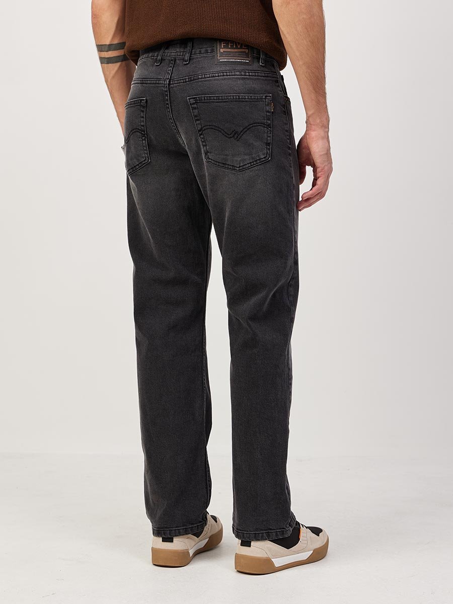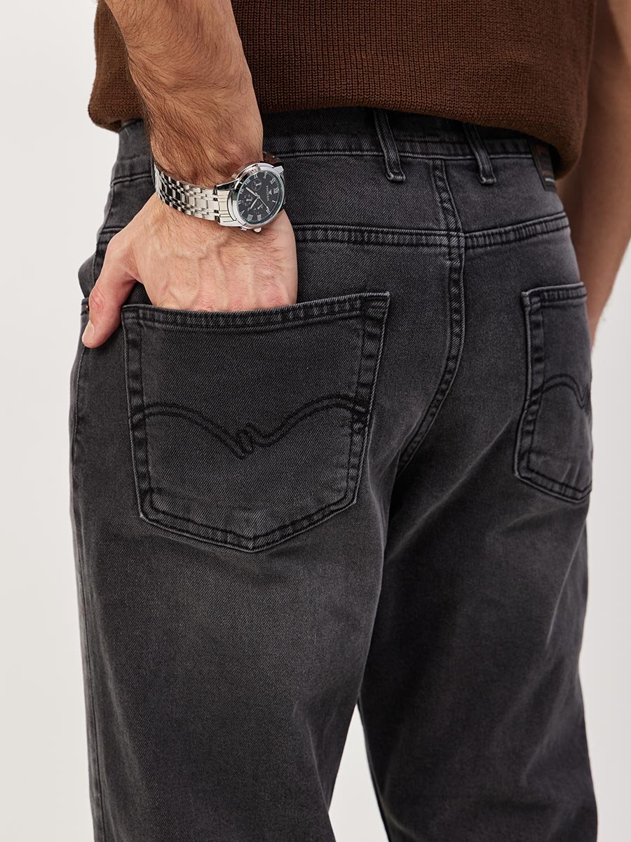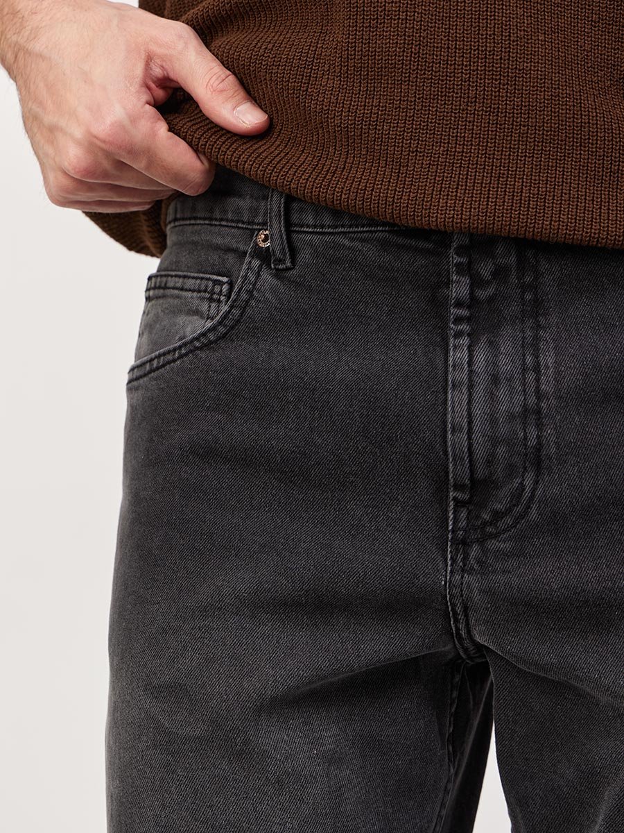 Мужские классические джинсы с пятью карманами. Посадка Comfort fit (свободные по бедру), широкие в колене и по низу, высокая талия. Застежка на молнии. Выполнены из слабоэластичной ткани denim comfort stretch, цвет ткани Black/Black (лицевая и изнаночная стороны ткани черные). Темная стирка с потёртостями и "усами" спереди и потёртостями сзади.