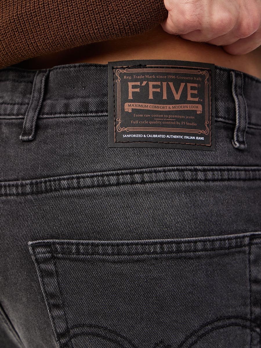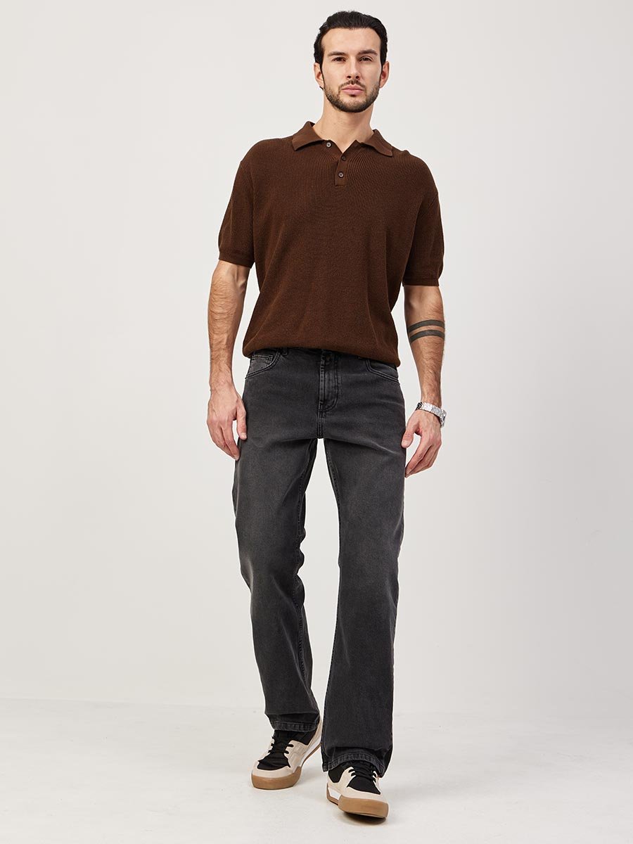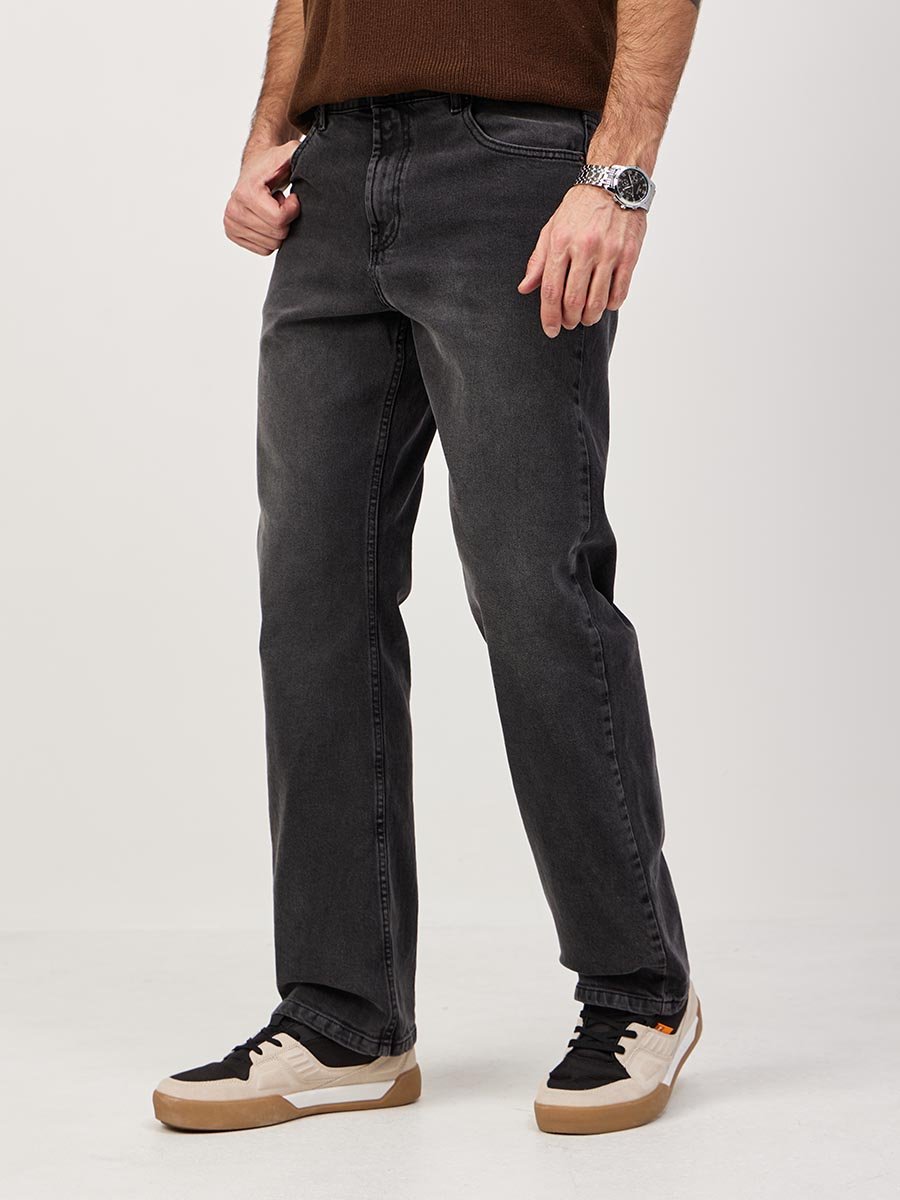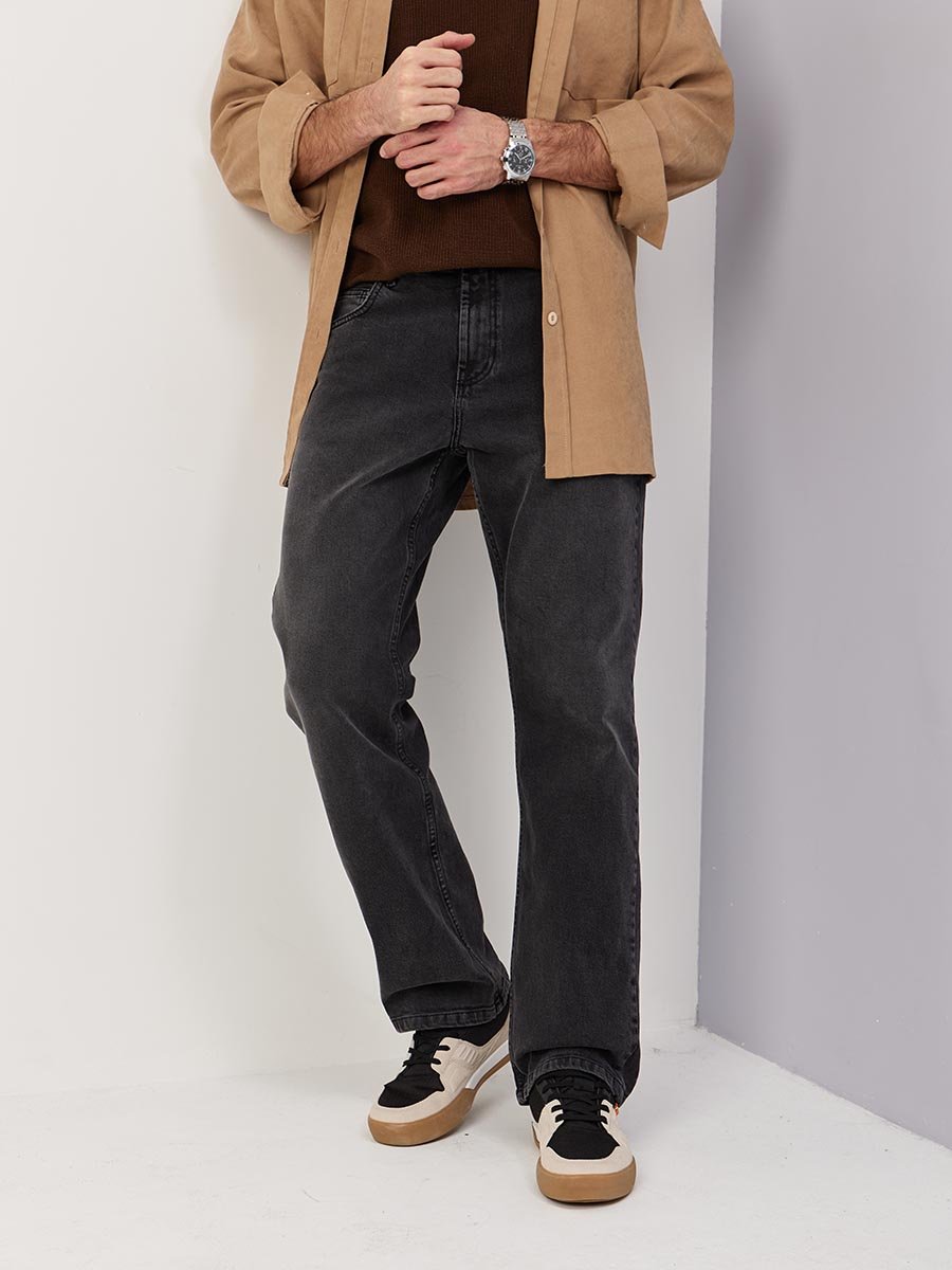 Мужские классические джинсы с пятью карманами. Посадка Comfort fit (свободные по бедру), широкие в колене и по низу, высокая талия. Застежка на молнии. Выполнены из слабоэластичной ткани denim comfort stretch, цвет ткани Black/Black (лицевая и изнаночная стороны ткани черные). Темная стирка с потёртостями и "усами" спереди и потёртостями сзади.