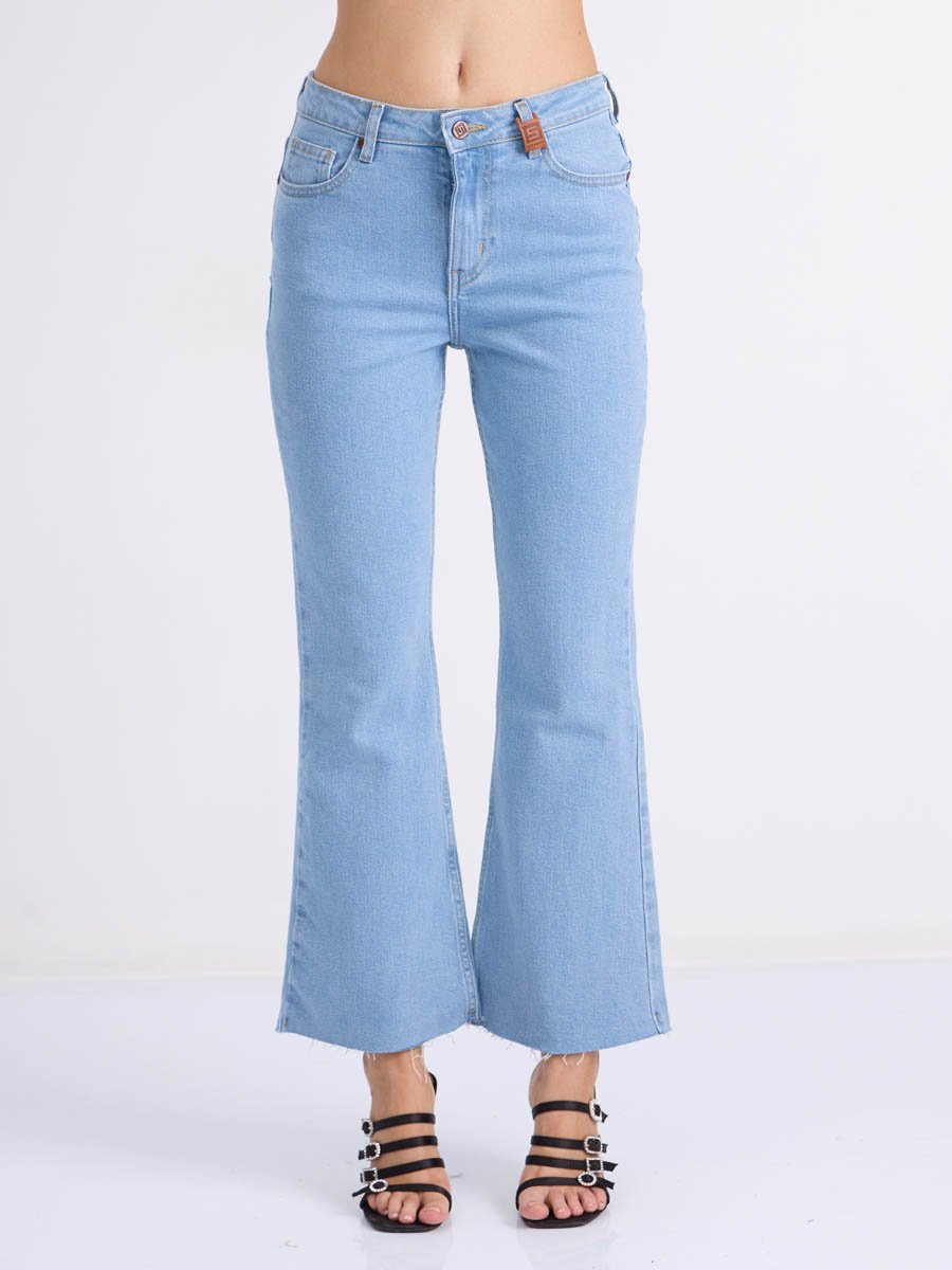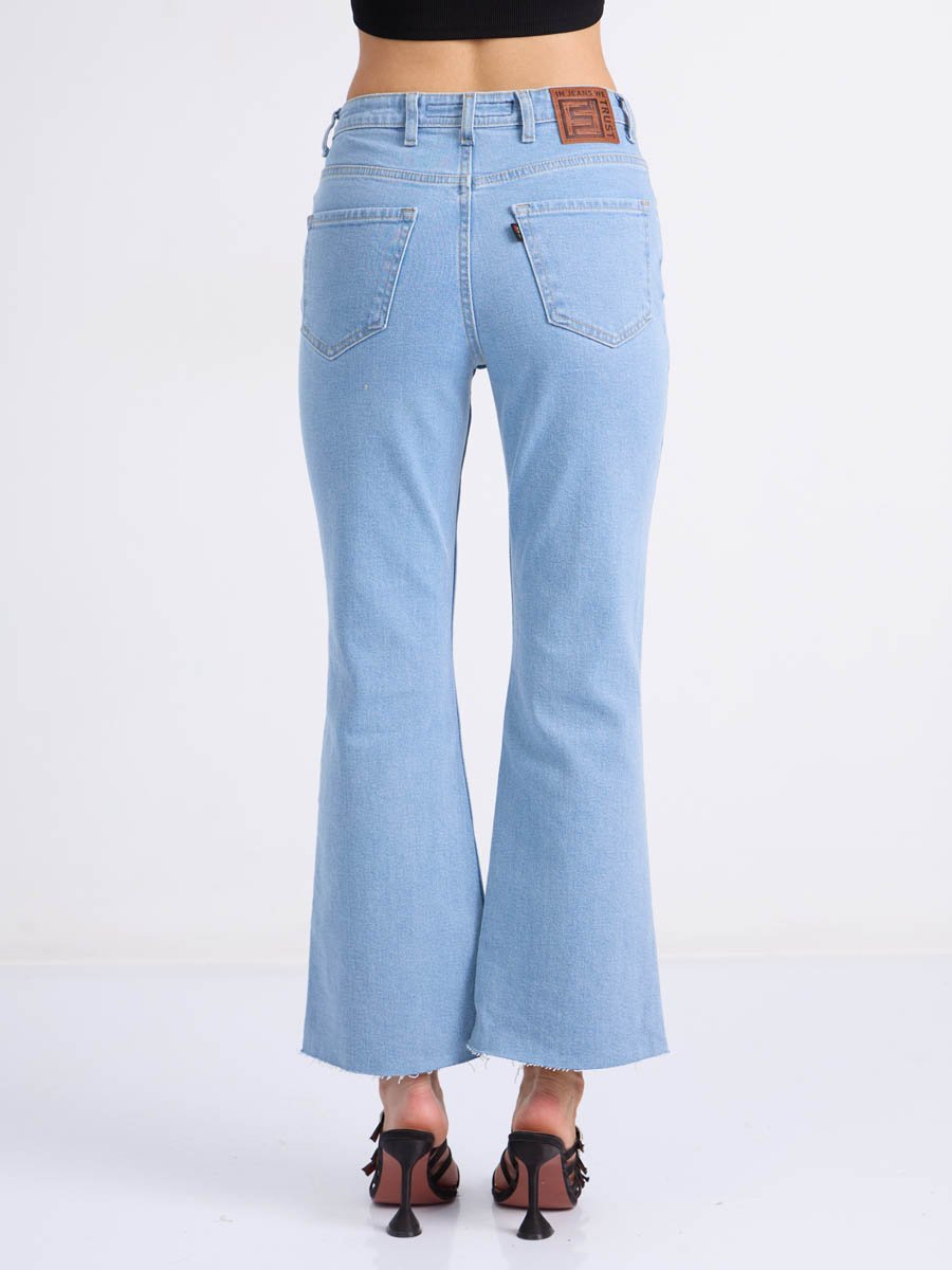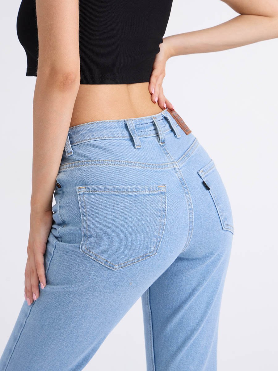 Женские джинсы с пятью карманами. Посадка Flare fit (полуоблегающие по бедру и расклешенные от колена), высокая талия, укороченной длины. Для улучшения посадки по талии сделан подкройной пояс из 2-х частей. Застежка на молнии. Выполнены из слабоэластичной ткани denim stretch. Классическая светлая стирка "stone wash"с отбеливанием.