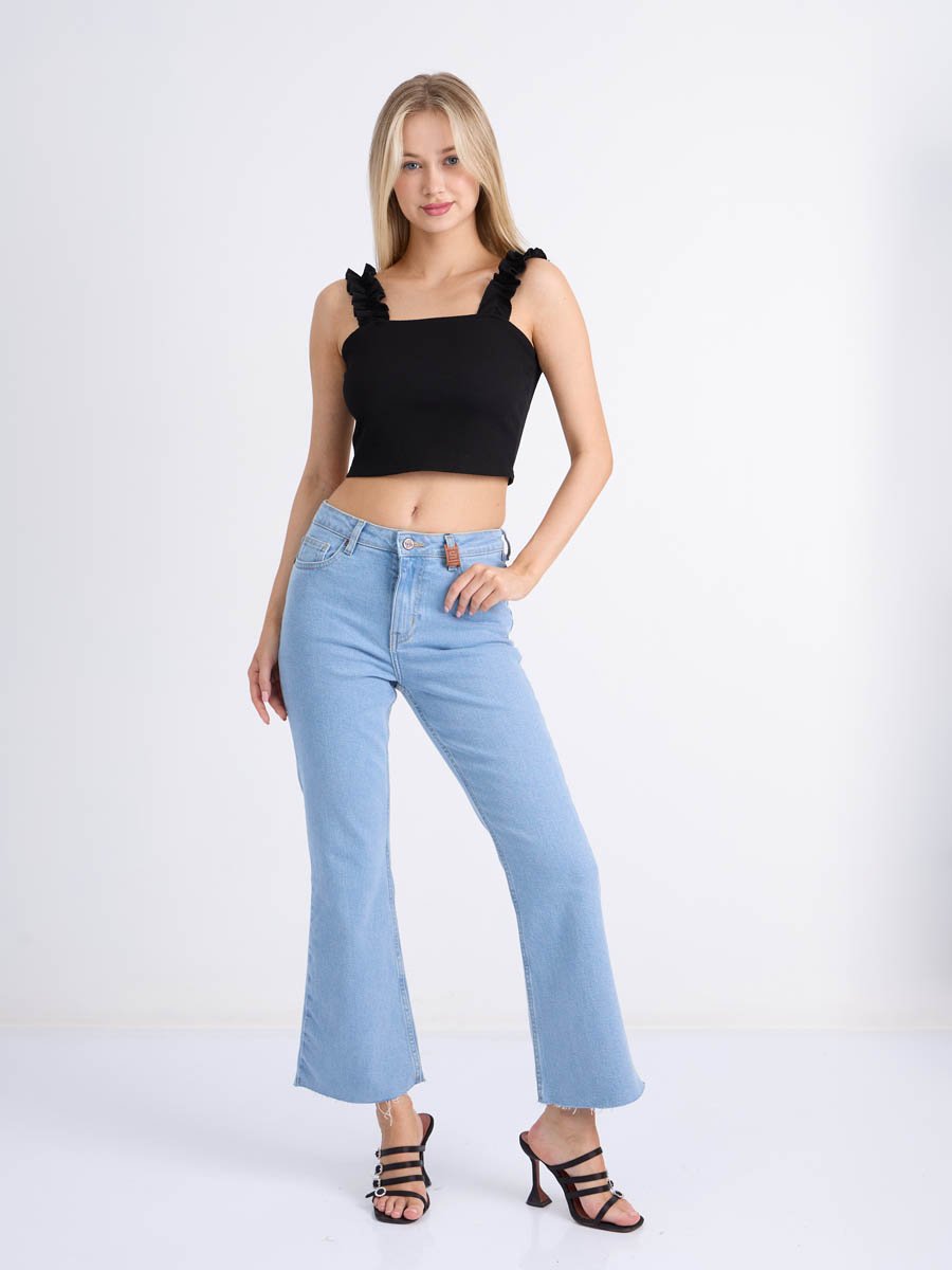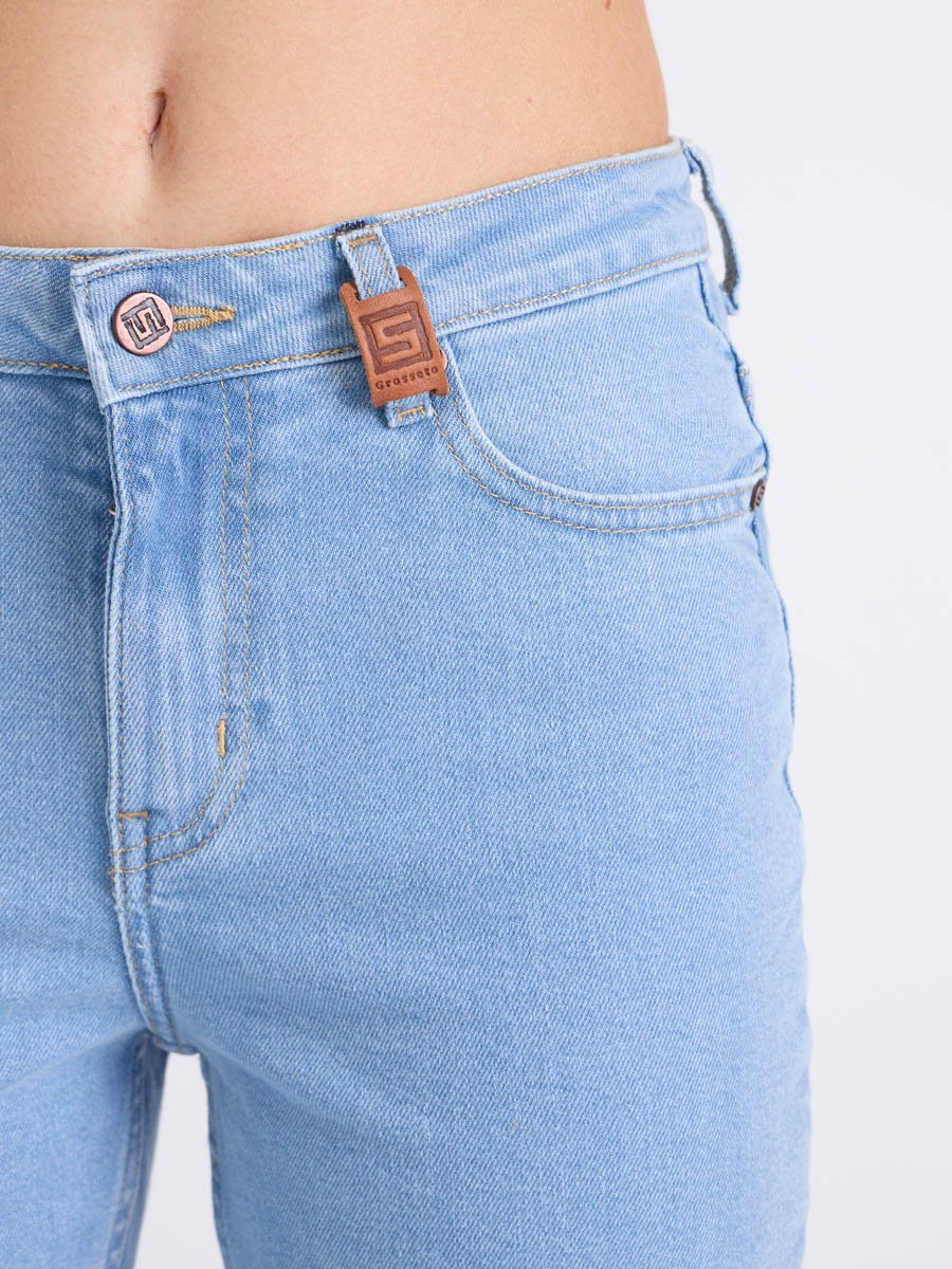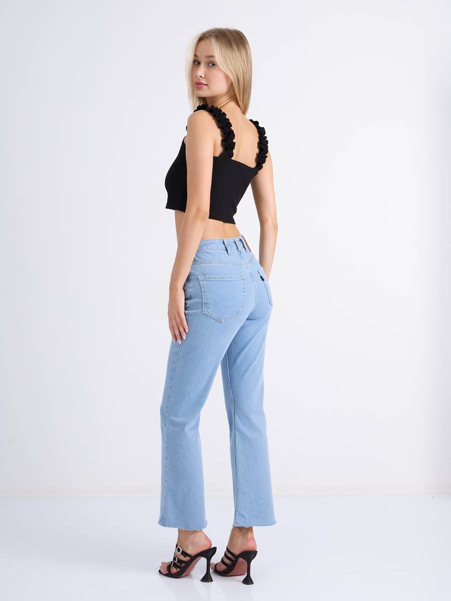Женские джинсы с пятью карманами. Посадка Flare fit (полуоблегающие по бедру и расклешенные от колена), высокая талия, укороченной длины. Для улучшения посадки по талии сделан подкройной пояс из 2-х частей. Застежка на молнии. Выполнены из слабоэластичной ткани denim stretch. Классическая светлая стирка "stone wash"с отбеливанием.