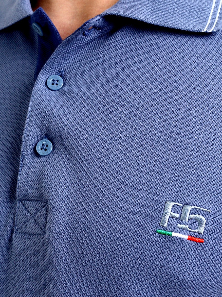 Классическая мужская футболка поло F5, Regular fit (полуприлегающий силуэт), с вышивкой-фирменным логотипом. Выполнена из трикотажного полотна пике (pique). С отложным воротником и короткими рукавами. Застежка-планка обработана пике контрастного цвета, застегивается на 3 пуговицы.