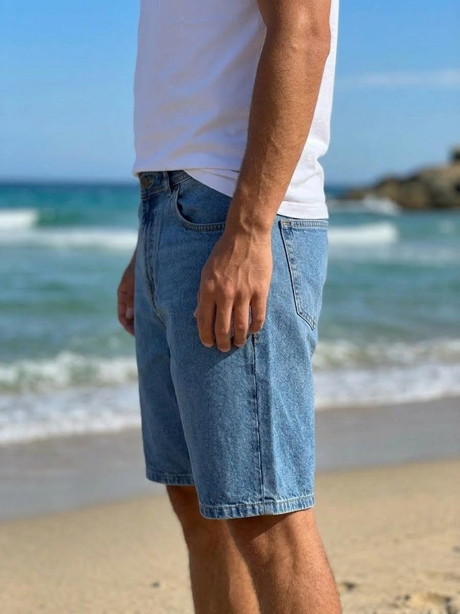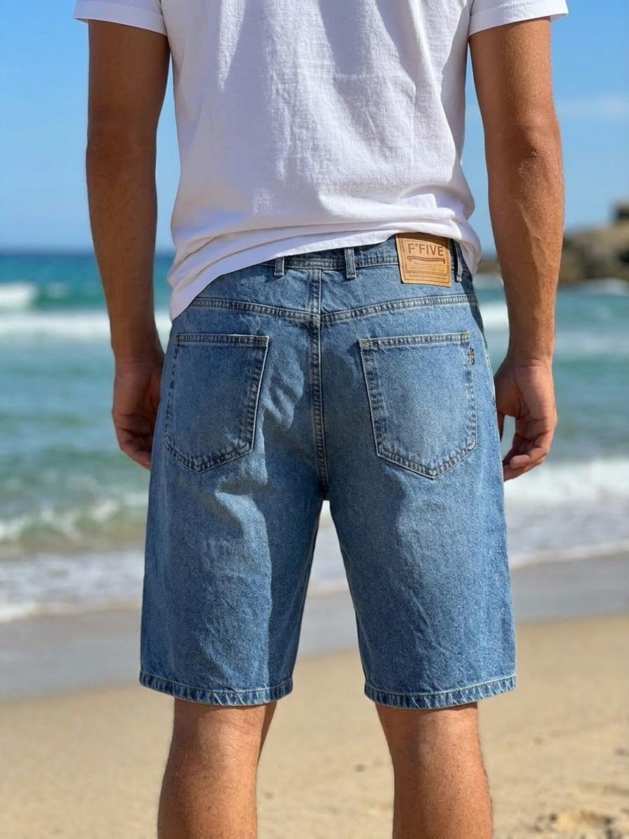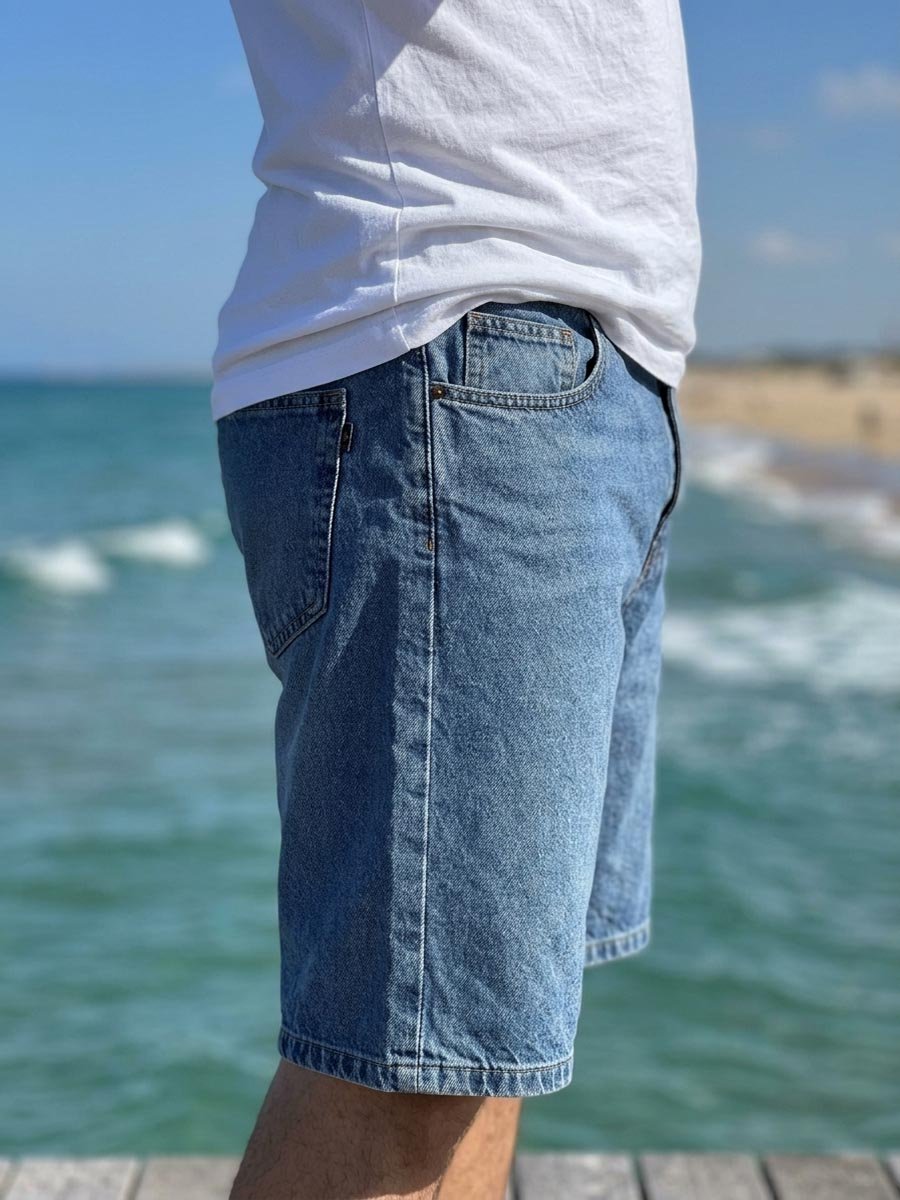 Мужские джинсовые шорты с пятью карманами. Посадка Comfort fit (свободные по бедру). Высокая талия спереди и сзади. Застежка на молнии. Изготовлены из традиционного хлопкового денима. Средняя стирка с потёртостями и "усами" спереди и потёртостями сзади.