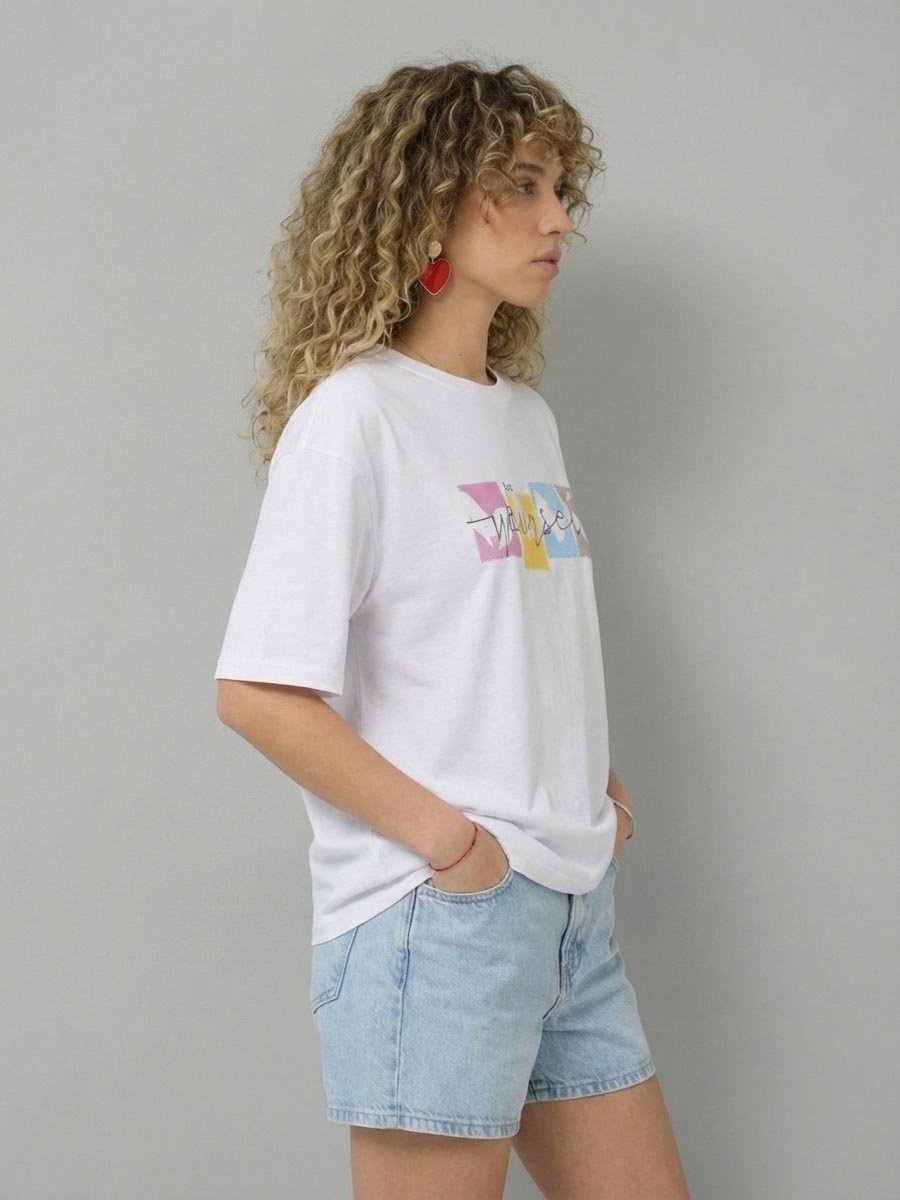 Женская футболка F5, Oversize fit (свободный силуэт), круглый вырез горловины, короткий цельнокроеный рукав. Выполнена из классического трикотажного полотна.