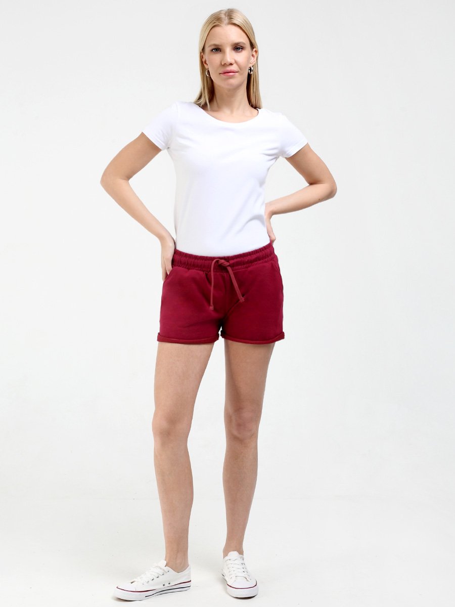 Женские трикотажные шорты, выполнены из хлопкового полотна с добавлением полиэстра. Приятны при контакте с кожей, не сковывают движения. В боковых швах глубокие карманы. По низу зафиксированные подвороты. В поясе шорты собираются широкой резинкой. Дополнительно в поясе имеется шнур.